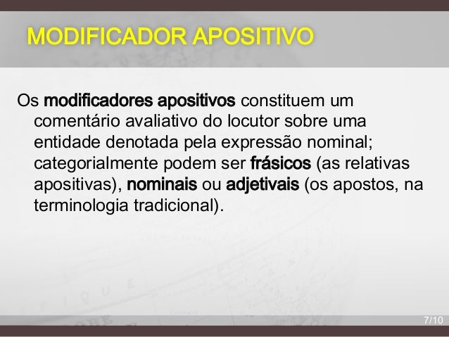 7. 7. MODIFICADOR APOSITIVO Os modificadores apositivos constituem um comentário avaliativo do locutor sobre uma entidade denotada pela expressão nominal; categorialmente podem ser frásicos (as relativas apositivas), nominais ou adjetivais (os apostos, na terminologia tradicional). 7/10