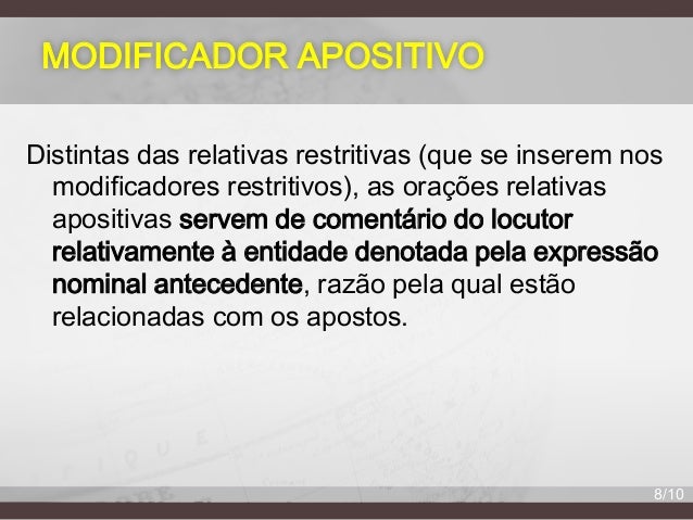 8. 8. MODIFICADOR APOSITIVO Distintas das relativas restritivas (que se inserem nos modificadores restritivos), as orações relativas apositivas servem de comentário do locutor relativamente à entidade denotada pela expressão nominal antecedente, razão pela qual estão relacionadas com os apostos. 8/10