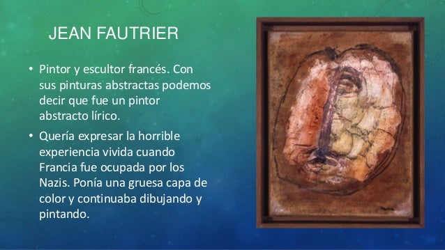 11. 11. JEAN FAUTRIER • Pintor y escultor francés. Con sus pinturas abstractas podemos decir que fue un pintor abstracto lírico. • Quería expresar la horrible experiencia vivida cuando Francia fue ocupada por los Nazis. Ponía una gruesa capa de color y continuaba dibujando y pintando.