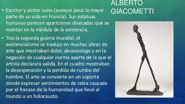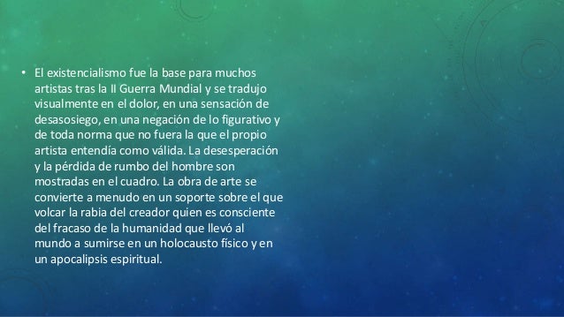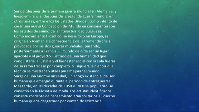 3. 3. Surgió (después de la primera guerra mundial en Alemania, y luego en Francia; después de la segunda guerra mundial en otros países, entre ellos los Estados Unidos), como intento de crear una nueva Concepción del Mundo en consonancia con los estados de ánimo de la intelectualidad burguesa. Como movimiento filosófico, se desarrolló en Europa, se origina en Alemania a consecuencia de la tremenda crisis provocada por las dos guerras mundiales, pasando, posteriormente a Francia. El mundo dejó de ser un lugar apacible y el proyecto ilustrado de una humanidad que conquistaría la justicia y el bienestar social con la sola fuerza de su razón fracasó por completo. Ni siquiera la ciencia o la técnica se mostraban útiles para mejorar el mundo. Surge de una enorme ansiedad, un ahogo existencial del ser humano que emergió durante el periodo de entreguerras. Más tarde, en las décadas de 1950 y 1960 se popularizó, se convirtió en la filosofía de moda. Los artistas identificados con esta corriente de pensamiento eran solitarios. El cuerpo humano queda desgarrado por contenido existencial.
