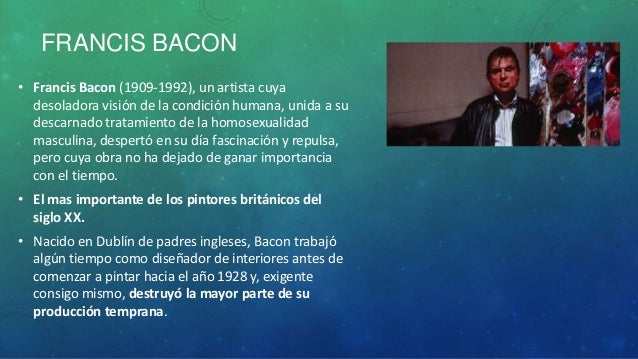 14. 14. FRANCIS BACON • Francis Bacon (1909-1992), un artista cuya desoladora visión de la condición humana, unida a su descarnado tratamiento de la homosexualidad masculina, despertó en su día fascinación y repulsa, pero cuya obra no ha dejado de ganar importancia con el tiempo. • El mas importante de los pintores británicos del siglo XX. • Nacido en Dublín de padres ingleses, Bacon trabajó algún tiempo como diseñador de interiores antes de comenzar a pintar hacia el año 1928 y, exigente consigo mismo, destruyó la mayor parte de su producción temprana.