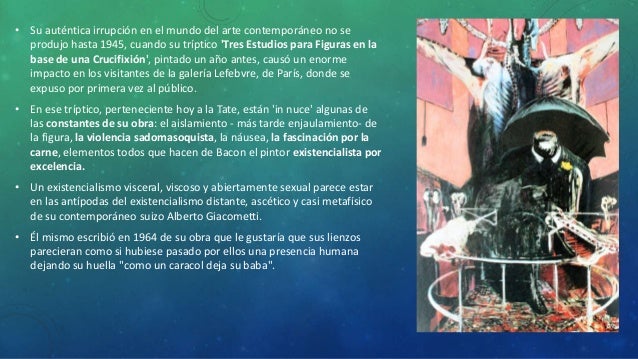 15. 15. • Su auténtica irrupción en el mundo del arte contemporáneo no se produjo hasta 1945, cuando su tríptico 'Tres Estudios para Figuras en la base de una Crucifixión', pintado un año antes, causó un enorme impacto en los visitantes de la galería Lefebvre, de París, donde se expuso por primera vez al público. • En ese tríptico, perteneciente hoy a la Tate, están 'in nuce' algunas de las constantes de su obra: el aislamiento - más tarde enjaulamiento- de la figura, la violencia sadomasoquista, la náusea, la fascinación por la carne, elementos todos que hacen de Bacon el pintor existencialista por excelencia. • Un existencialismo visceral, viscoso y abiertamente sexual parece estar en las antípodas del existencialismo distante, ascético y casi metafísico de su contemporáneo suizo Alberto Giacometti. • Él mismo escribió en 1964 de su obra que le gustaría que sus lienzos parecieran como si hubiese pasado por ellos una presencia humana dejando su huella "como un caracol deja su baba".