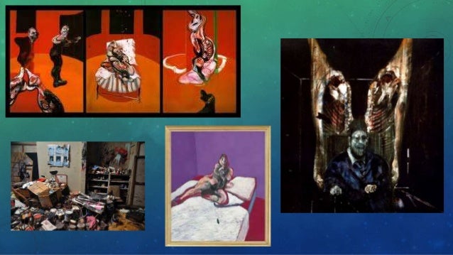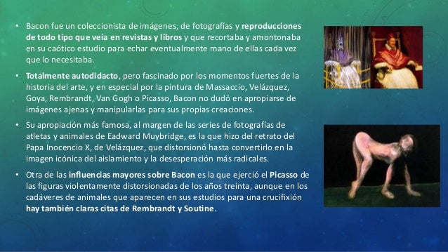 16. 16. • Bacon fue un coleccionista de imágenes, de fotografías y reproducciones de todo tipo que veía en revistas y libros y que recortaba y amontonaba en su caótico estudio para echar eventualmente mano de ellas cada vez que lo necesitaba. • Totalmente autodidacto, pero fascinado por los momentos fuertes de la historia del arte, y en especial por la pintura de Massaccio, Velázquez, Goya, Rembrandt, Van Gogh o Picasso, Bacon no dudó en apropiarse de imágenes ajenas y manipularlas para sus propias creaciones. • Su apropiación más famosa, al margen de las series de fotografías de atletas y animales de Eadward Muybridge, es la que hizo del retrato del Papa Inocencio X, de Velázquez, que distorsionó hasta convertirlo en la imagen icónica del aislamiento y la desesperación más radicales. • Otra de las influencias mayores sobre Bacon es la que ejerció el Picasso de las figuras violentamente distorsionadas de los años treinta, aunque en los cadáveres de animales que aparecen en sus estudios para una crucifixión hay también claras citas de Rembrandt y Soutine.