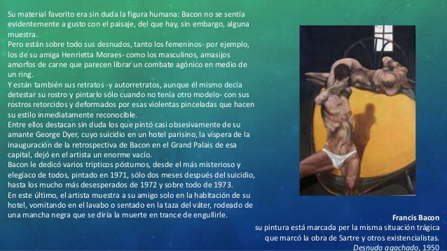17. 17. Francis Bacon su pintura está marcada per la misma situación trágica que marcó la obra de Sartre y otros existencialistas. Desnudo agachado, 1950 Su material favorito era sin duda la figura humana: Bacon no se sentía evidentemente a gusto con el paisaje, del que hay, sin embargo, alguna muestra. Pero están sobre todo sus desnudos, tanto los femeninos- por ejemplo, los de su amiga Henrietta Moraes- como los masculinos, amasijos amorfos de carne que parecen librar un combate agónico en medio de un ring. Y están también sus retratos -y autorretratos, aunque él mismo decía detestar su rostro y pintarlo sólo cuando no tenía otro modelo- con sus rostros retorcidos y deformados por esas violentas pinceladas que hacen su estilo inmediatamente reconocible. Entre ellos destacan sin duda los que pintó casi obsesivamente de su amante George Dyer, cuyo suicidio en un hotel parisino, la víspera de la inauguración de la retrospectiva de Bacon en el Grand Palais de esa capital, dejó en el artista un enorme vacío. Bacon le dedicó varios trípticos póstumos, desde el más misterioso y elegíaco de todos, pintado en 1971, sólo dos meses después del suicidio, hasta los mucho más desesperados de 1972 y sobre todo de 1973. En este último, el artista muestra a su amigo solo en la habitación de su hotel, vomitando en el lavabo o sentado en la taza del váter, rodeado de una mancha negra que se diría la muerte en trance de engullirle.