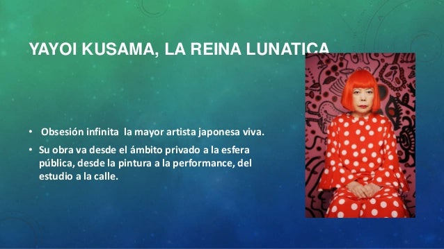 18. 18. YAYOI KUSAMA, LA REINA LUNATICA • Obsesión infinita la mayor artista japonesa viva. • Su obra va desde el ámbito privado a la esfera pública, desde la pintura a la performance, del estudio a la calle.
