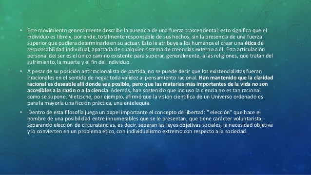 5. 5. • Este movimiento generalmente describe la ausencia de una fuerza trascendental; esto significa que el individuo es libre y, por ende, totalmente responsable de sus hechos, sin la presencia de una fuerza superior que pudiera determinarle en su actuar. Esto le atribuye a los humanos el crear una ética de responsabilidad individual, apartada de cualquier sistema de creencias externo a él. Esta articulación personal del ser es el único camino existente para superar, generalmente, a las religiones, que tratan del sufrimiento, la muerte y el fin del individuo. • A pesar de su posición antirracionalista de partida, no se puede decir que los existencialistas fueran irracionales en el sentido de negar toda validez al pensamiento racional. Han mantenido que la claridad racional es deseable allí donde sea posible, pero que las materias más importantes de la vida no son accesibles a la razón o a la ciencia. Además, han sostenido que incluso la ciencia no es tan racional como se supone. Nietzsche, por ejemplo, afirmó que la visión científica de un Universo ordenado es para la mayoría una ficción práctica, una entelequia. • Dentro de esta filosofía juega un papel importante el concepto de libertad: " elección" que hace el hombre de una posibilidad entre innumerables que se le presentan, que tiene carácter voluntarista, separando elección de circunstancias, es decir, separan las leyes objetivas sociales, la necesidad objetiva y lo convierten en un problema ético, con individualismo extremo con respecto a la sociedad.