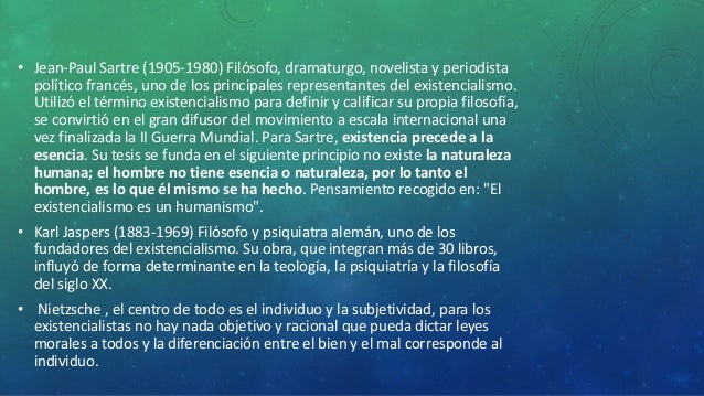 7. 7. • Jean-Paul Sartre (1905-1980) Filósofo, dramaturgo, novelista y periodista político francés, uno de los principales representantes del existencialismo. Utilizó el término existencialismo para definir y calificar su propia filosofía, se convirtió en el gran difusor del movimiento a escala internacional una vez finalizada la II Guerra Mundial. Para Sartre, existencia precede a la esencia. Su tesis se funda en el siguiente principio no existe la naturaleza humana; el hombre no tiene esencia o naturaleza, por lo tanto el hombre, es lo que él mismo se ha hecho. Pensamiento recogido en: "El existencialismo es un humanismo". • Karl Jaspers (1883-1969) Filósofo y psiquiatra alemán, uno de los fundadores del existencialismo. Su obra, que integran más de 30 libros, influyó de forma determinante en la teología, la psiquiatría y la filosofía del siglo XX. • Nietzsche , el centro de todo es el individuo y la subjetividad, para los existencialistas no hay nada objetivo y racional que pueda dictar leyes morales a todos y la diferenciación entre el bien y el mal corresponde al individuo.