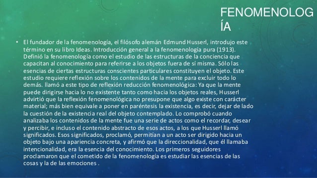 9. 9. FENOMENOLOG ÍA • El fundador de la fenomenología, el filósofo alemán Edmund Husserl, introdujo este término en su libro Ideas. Introducción general a la fenomenología pura (1913). Definió la fenomenología como el estudio de las estructuras de la conciencia que capacitan al conocimiento para referirse a los objetos fuera de sí misma. Sólo las esencias de ciertas estructuras conscientes particulares constituyen el objeto. Este estudio requiere reflexión sobre los contenidos de la mente para excluir todo lo demás. llamó a este tipo de reflexión reducción fenomenológica: Ya que la mente puede dirigirse hacia lo no existente tanto como hacia los objetos reales, Husserl advirtió que la reflexión fenomenológica no presupone que algo existe con carácter material; más bien equivale a poner en paréntesis la existencia, es decir, dejar de lado la cuestión de la existencia real del objeto contemplado. Lo comprobó cuando analizaba los contenidos de la mente fue una serie de actos como el recordar, desear y percibir, e incluso el contenido abstracto de esos actos, a los que Husserl llamó significados. Esos significados, proclamó, permitían a un acto ser dirigido hacia un objeto bajo una apariencia concreta, y afirmó que la direccionalidad, que él llamaba intencionalidad, era la esencia del conocimiento. Los primeros seguidores proclamaron que el cometido de la fenomenología es estudiar las esencias de las cosas y la de las emociones .