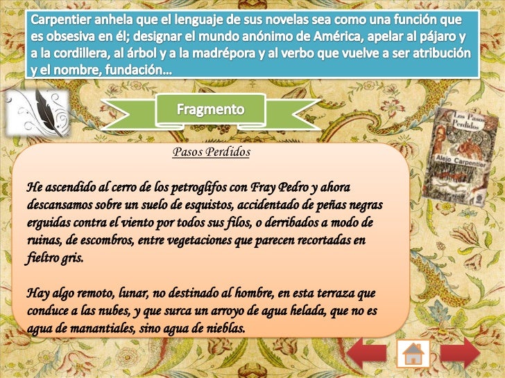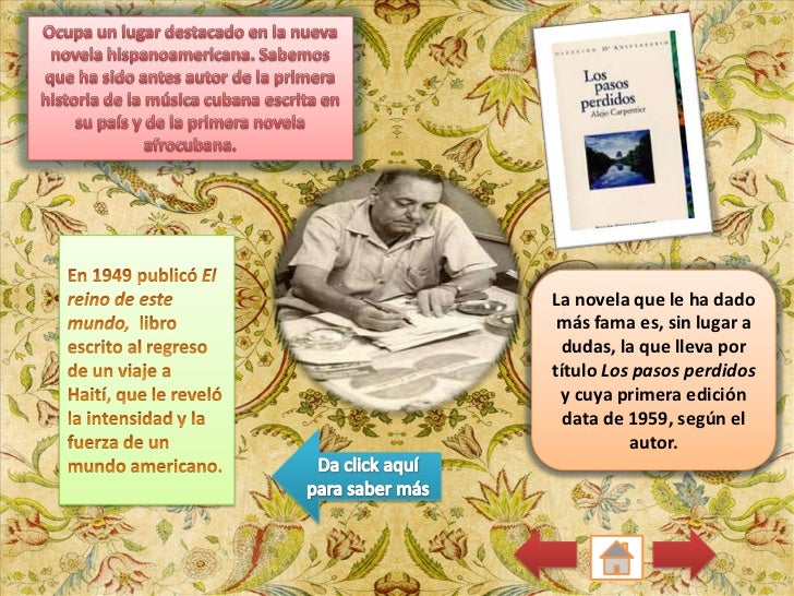 9. 9. La novela que le ha dado más fama es, sin lugar a dudas, la que lleva portítulo Los pasos perdidos y cuya primera edición data de 1959, según el autor.