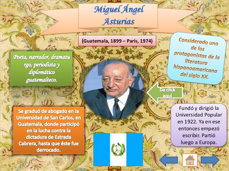 11. 11. (Guatemala, 1899 – París, 1974) Fundó y dirigió la Universidad Popular en 1922. Ya en ese entonces empezó escribir. Partió luego a Europa.