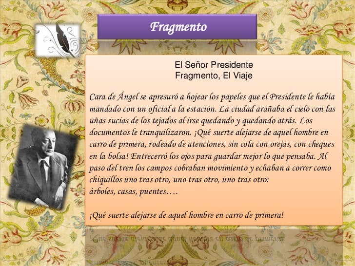 13. 13. Fragmento El Señor Presidente Fragmento, El ViajeCara de Ángel se apresuró a hojear los papeles que el Presidente le habíamandado con un oficial a la estación. La ciudad arañaba el cielo con lasuñas sucias de los tejados al irse quedando y quedando atrás. Losdocumentos le tranquilizaron. ¡Qué suerte alejarse de aquel hombre encarro de primera, rodeado de atenciones, sin cola con orejas, con chequesen la bolsa! Entrecerró los ojos para guardar mejor lo que pensaba. Alpaso del tren los campos cobraban movimiento y echaban a correr comochiquillos uno tras otro, uno tras otro, uno tras otro:árboles, casas, puentes….¡Qué suerte alejarse de aquel hombre en carro de primera!
