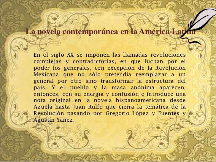 2. 2. La novela contemporánea en la América Latina En el siglo XX se imponen las llamadas revoluciones complejas y contradictorias, en que luchan por el poder los generales, con excepción de la Revolución Mexicana que no sólo pretendía reemplazar a un general por otro sino transformar la estructura del país. Y el pueblo y la masa anónima aparecen, entonces, con su energía y confusión e introduce una nota original en la novela hispanoamericana desde Azuela hasta Juan Rulfo que cierra la temática de la Revolución pasando por Gregorio López y Fuentes y Agustín Yáñez.