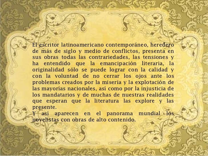 3. 3. El escritor latinoamericano contemporáneo, herederode más de siglo y medio de conflictos, presenta ensus obras todas las contrariedades, las tensiones yha entendido que la emancipación literaria, laoriginalidad sólo se puede lograr con la calidad ycon la voluntad de no cerrar los ojos ante losproblemas creados por la miseria y la explotación delas mayorías nacionales, así como por la injusticia delos mandatarios y de muchas de nuestras realidadesque esperan que la literatura las explore y laspresente.Y así aparecen en el panorama mundial losnovelistas con obras de alto contenido.