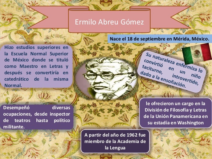 4. 4. Ermilo Abreu Gómez Nace el 18 de septiembre en Mérida, México.Hizo estudios superiores enla Escuela Normal Superiorde México donde se titulócomo Maestro en Letras ydespués se convertiría encatedrático de la mismaNormal. le ofrecieron un cargo en laDesempeñó diversas División de Filosofía y Letrasocupaciones, desde inspector de la Unión Panamericana ende teatros hasta político su estadía en Washingtonmilitante. A partir del año de 1962 fue miembro de la Academia de la Lengua