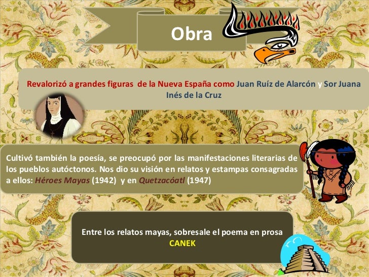 5. 5. Obra Revalorizó a grandes figuras de la Nueva España como Juan Ruíz de Alarcón y Sor Juana Inés de la CruzCultivó también la poesía, se preocupó por las manifestaciones literarias delos pueblos autóctonos. Nos dio su visión en relatos y estampas consagradasa ellos: Héroes Mayas (1942) y en Quetzacóatl (1947) Entre los relatos mayas, sobresale el poema en prosa CANEK