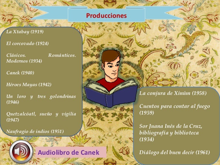 6. 6. ProduccionesLa Xtabay (1919)El corcovado (1924)Clásicos. Románticos.Modernos (1934)Canek (1940)Héroes Mayas (1942) La conjura de Xinúm (1958)Un loro y tres golondrinas(1946) Cuentos para contar al fuegoQuetzalcóatl, sueño y vigilia (1959)(1947) Sor Juana Inés de la Cruz,Naufragio de indios (1951) bibliografía y biblioteca (1934) Audiolibro de Canek Diálogo del buen decir (1961)