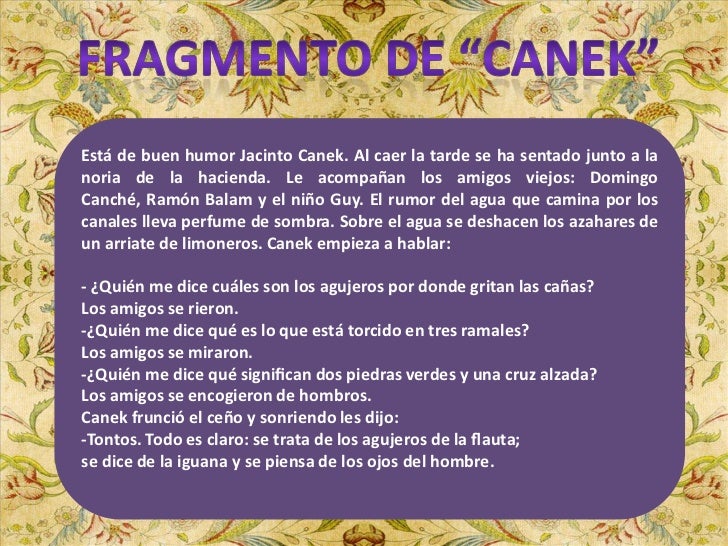 7. 7. Está de buen humor Jacinto Canek. Al caer la tarde se ha sentado junto a lanoria de la hacienda. Le acompañan los amigos viejos: DomingoCanché, Ramón Balam y el niño Guy. El rumor del agua que camina por loscanales lleva perfume de sombra. Sobre el agua se deshacen los azahares deun arriate de limoneros. Canek empieza a hablar:- ¿Quién me dice cuáles son los agujeros por donde gritan las cañas?Los amigos se rieron.-¿Quién me dice qué es lo que está torcido en tres ramales?Los amigos se miraron.-¿Quién me dice qué significan dos piedras verdes y una cruz alzada?Los amigos se encogieron de hombros.Canek frunció el ceño y sonriendo les dijo:-Tontos. Todo es claro: se trata de los agujeros de la flauta;se dice de la iguana y se piensa de los ojos del hombre.