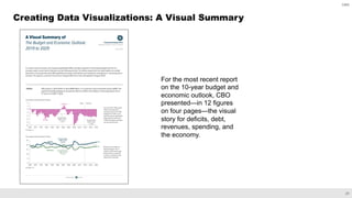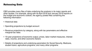 The transparency of CBO’s work has always been a priority, and this year the agency has added and shifted resources to redouble its efforts in that area. CBO has three goals in being transparent: 1. CBO seeks to promote a thorough understanding of its analyses by sharing information in an accessible, clear, and detailed manner. 2. CBO wants to help people gauge how its estimates might change if policies or circumstances were different. 3. CBO aims to enhance the credibility of its work by showing how it relies on data, professional research, and expert feedback. Presentation by Mark Hadley, CBO’s Deputy Director, at the 11th Annual Meeting of the OECD Network of Parliamentary Budget Officials and Independent Financial Institutions.