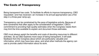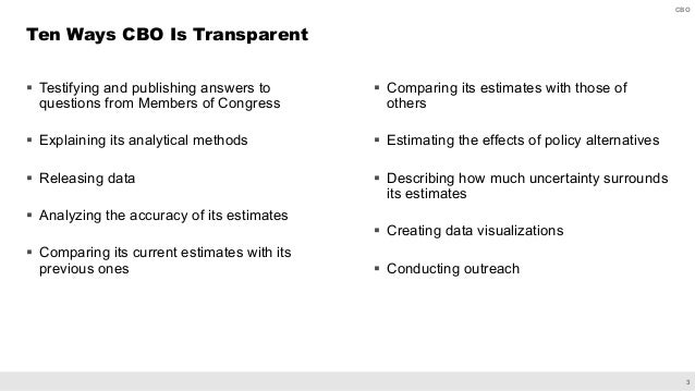 The transparency of CBO’s work has always been a priority, and this year the agency has added and shifted resources to redouble its efforts in that area. CBO has three goals in being transparent: