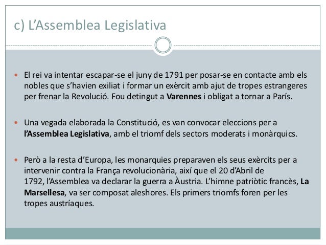 9. 9. c) L’Assemblea Legislativa El rei va intentar escapar-se el juny de 1791 per posar-se en contacte amb els nobles que s’havien exiliat i formar un exèrcit amb ajut de tropes estrangeres per frenar la Revolució. Fou detingut a Varennes i obligat a tornar a París. Una vegada elaborada la Constitució, es van convocar eleccions per a l’Assemblea Legislativa, amb el triomf dels sectors moderats i monàrquics. Però a la resta d’Europa, les monarquies preparaven els seus exèrcits per a intervenir contra la França revolucionària, així que el 20 d’Abril de 1792, l’Assemblea va declarar la guerra a Àustria. L’himne patriòtic francès, La Marsellesa, va ser composat aleshores. Els primers triomfs foren per les tropes austríaques.