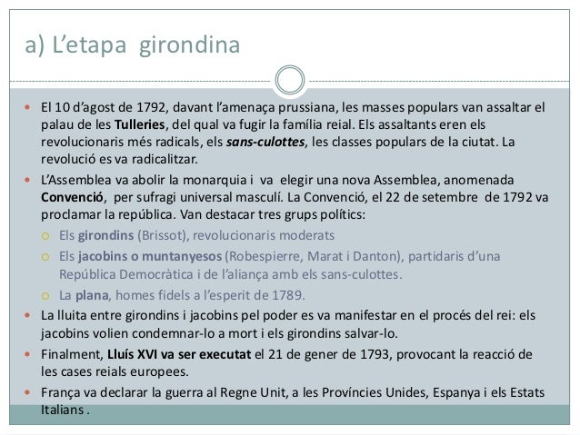 a) L’etapa girondina El 10 d’agost de 1792, davant l’amenaça prussiana, les masses populars van assaltar el    palau de l...