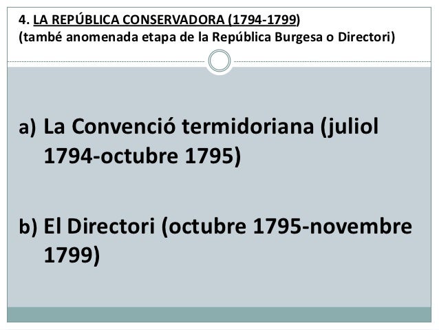 4. LA REPÚBLICA CONSERVADORA (1794-1799)(també anomenada etapa de la República Burgesa o Directori)a) La Convenció termido...