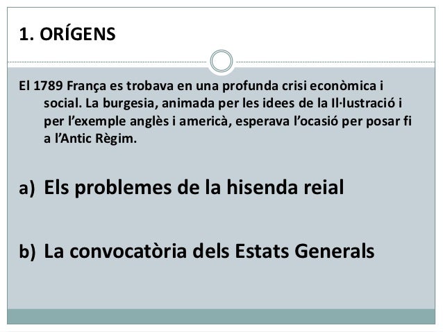 2. 2. 1. ORÍGENSEl 1789 França es trobava en una profunda crisi econòmica i social. La burgesia, animada per les idees de la Il·lustració i per l’exemple anglès i americà, esperava l’ocasió per posar fi a l’Antic Règim.a) Els problemes de la hisenda reialb) La convocatòria dels Estats Generals