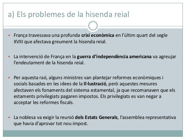 3. 3. a) Els problemes de la hisenda reial França travessava una profunda crisi econòmica en l’últim quart del segle XVIII que afectava greument la hisenda reial. La intervenció de França en la guerra d’independència americana va agreujar l’endeutament de la hisenda reial. Per aquesta raó, alguns ministres van plantejar reformes econòmiques i socials basades en les idees de la Il·lustració, però aquestes mesures afectaven els fonaments del sistema estamental, ja que recomanaven que els estaments privilegiats pagaren impostos. Els privilegiats es van negar a acceptar les reformes fiscals. La noblesa va exigir la reunió dels Estats Generals, l’assemblea representativa que havia d’aprovar tot nou impost.