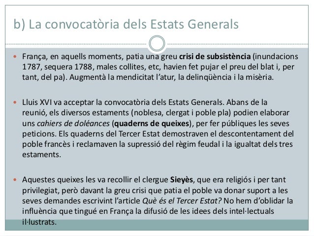 4. 4. b) La convocatòria dels Estats Generals França, en aquells moments, patia una greu crisi de subsistència (inundacions 1787, sequera 1788, males collites, etc, havien fet pujar el preu del blat i, per tant, del pa). Augmentà la mendicitat l’atur, la delinqüència i la misèria. Lluis XVI va acceptar la convocatòria dels Estats Generals. Abans de la reunió, els diversos estaments (noblesa, clergat i poble pla) podien elaborar uns cahiers de doléances (quaderns de queixes), per fer públiques les seves peticions. Els quaderns del Tercer Estat demostraven el descontentament del poble francès i reclamaven la supressió del règim feudal i la igualtat dels tres estaments. Aquestes queixes les va recollir el clergue Sieyès, que era religiós i per tant privilegiat, però davant la greu crisi que patia el poble va donar suport a les seves demandes escrivint l’article Què és el Tercer Estat? No hem d’oblidar la influència que tingué en França la difusió de les idees dels intel·lectuals il·lustrats.