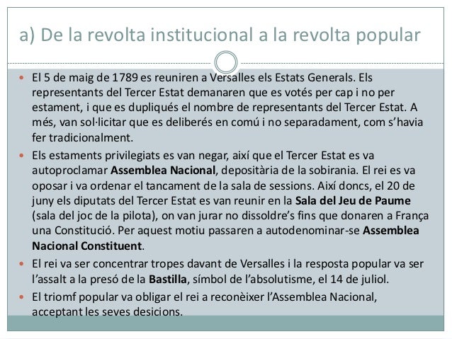 7. 7. a) De la revolta institucional a la revolta popular El 5 de maig de 1789 es reuniren a Versalles els Estats Generals. Els representants del Tercer Estat demanaren que es votés per cap i no per estament, i que es dupliqués el nombre de representants del Tercer Estat. A més, van sol·licitar que es deliberés en comú i no separadament, com s’havia fer tradicionalment. Els estaments privilegiats es van negar, així que el Tercer Estat es va autoproclamar Assemblea Nacional, depositària de la sobirania. El rei es va oposar i va ordenar el tancament de la sala de sessions. Així doncs, el 20 de juny els diputats del Tercer Estat es van reunir en la Sala del Jeu de Paume (sala del joc de la pilota), on van jurar no dissoldre’s fins que donaren a França una Constitució. Per aquest motiu passaren a autodenominar-se Assemblea Nacional Constituent. El rei va ser concentrar tropes davant de Versalles i la resposta popular va ser l’assalt a la presó de la Bastilla, símbol de l’absolutisme, el 14 de juliol. El triomf popular va obligar el rei a reconèixer l’Assemblea Nacional, acceptant les seves desicions.