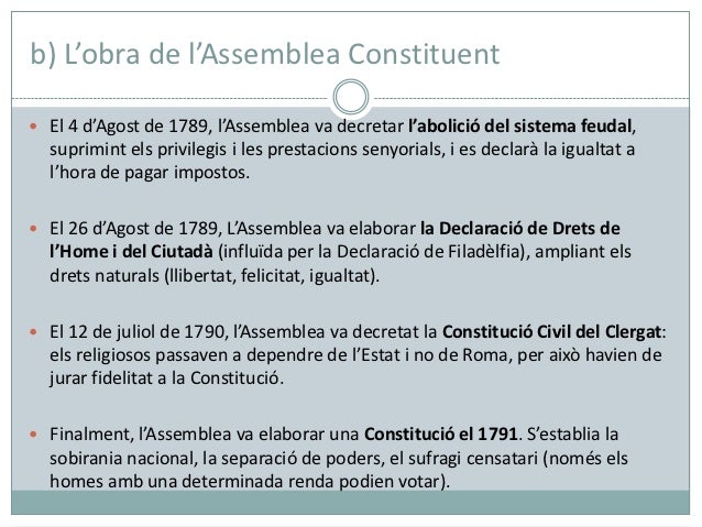 8. 8. b) L’obra de l’Assemblea Constituent El 4 d’Agost de 1789, l’Assemblea va decretar l’abolició del sistema feudal, suprimint els privilegis i les prestacions senyorials, i es declarà la igualtat a l’hora de pagar impostos. El 26 d’Agost de 1789, L’Assemblea va elaborar la Declaració de Drets de l’Home i del Ciutadà (influïda per la Declaració de Filadèlfia), ampliant els drets naturals (llibertat, felicitat, igualtat). El 12 de juliol de 1790, l’Assemblea va decretat la Constitució Civil del Clergat: els religiosos passaven a dependre de l’Estat i no de Roma, per això havien de jurar fidelitat a la Constitució. Finalment, l’Assemblea va elaborar una Constitució el 1791. S’establia la sobirania nacional, la separació de poders, el sufragi censatari (només els homes amb una determinada renda podien votar).