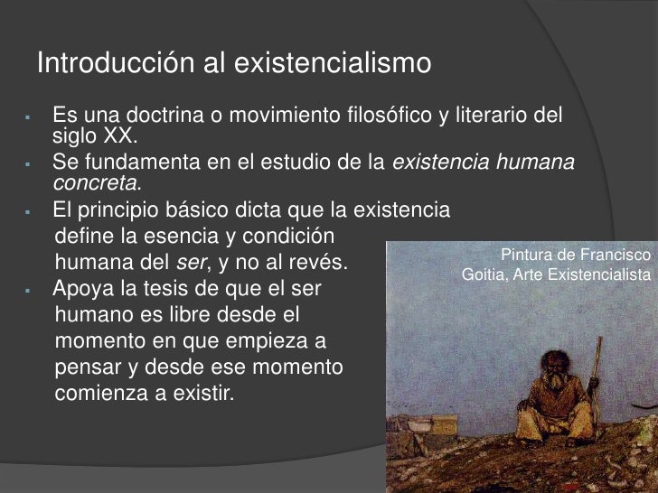 4. 4. El principio básico dicta que la existencia</li></ul> define la esencia y condición <br /> humana del ser, y no al revés.<br /><ul><li>Apoya la tesis de que el ser </li></ul> humano es libre desde el <br /> momento en que empieza a <br /> pensar y desde ese momento <br /> comienza a existir.<br />Pintura de Francisco Goitia, Arte Existencialista<br />