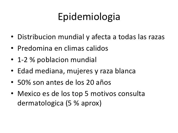 7. 7. Epidemiologia• Distribucion mundial y afecta a todas las razas• Predomina en climas calidos• 1-2 % poblacion mundial• Edad mediana, mujeres y raza blanca• 50% son antes de los 20 años• Mexico es de los top 5 motivos consulta dermatologica (5 % aprox)