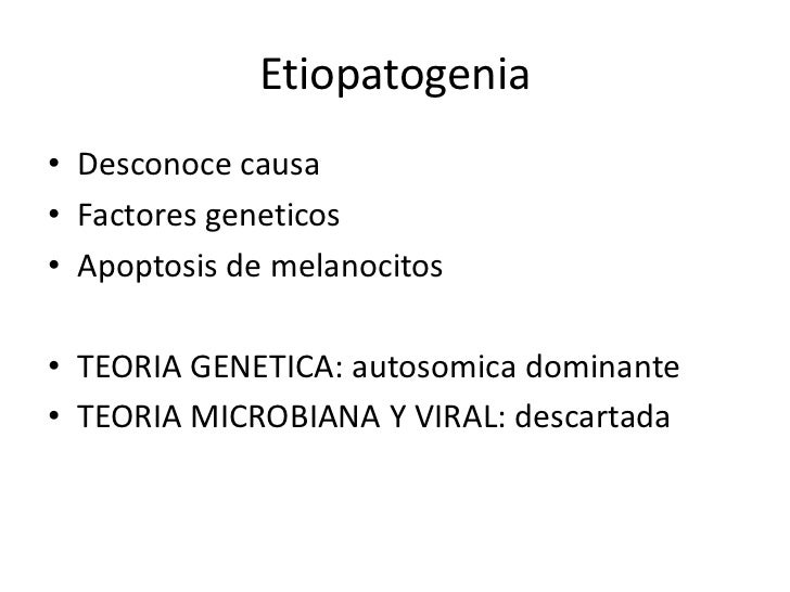 Etiopatogenia• Desconoce causa• Factores geneticos• Apoptosis de melanocitos• TEORIA GENETICA: autosomica dominante• TEORI...