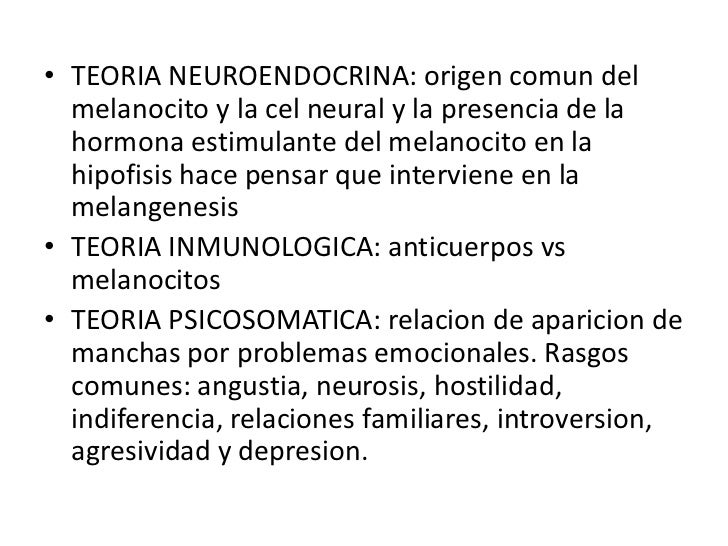 9. 9. • TEORIA NEUROENDOCRINA: origen comun del melanocito y la cel neural y la presencia de la hormona estimulante del melanocito en la hipofisis hace pensar que interviene en la melangenesis• TEORIA INMUNOLOGICA: anticuerpos vs melanocitos• TEORIA PSICOSOMATICA: relacion de aparicion de manchas por problemas emocionales. Rasgos comunes: angustia, neurosis, hostilidad, indiferencia, relaciones familiares, introversion, agresividad y depresion.