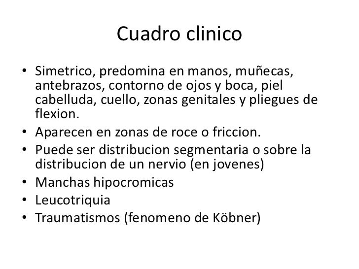 10. 10. Cuadro clinico• Simetrico, predomina en manos, muñecas, antebrazos, contorno de ojos y boca, piel cabelluda, cuello, zonas genitales y pliegues de flexion.• Aparecen en zonas de roce o friccion.• Puede ser distribucion segmentaria o sobre la distribucion de un nervio (en jovenes)• Manchas hipocromicas• Leucotriquia• Traumatismos (fenomeno de Köbner)
