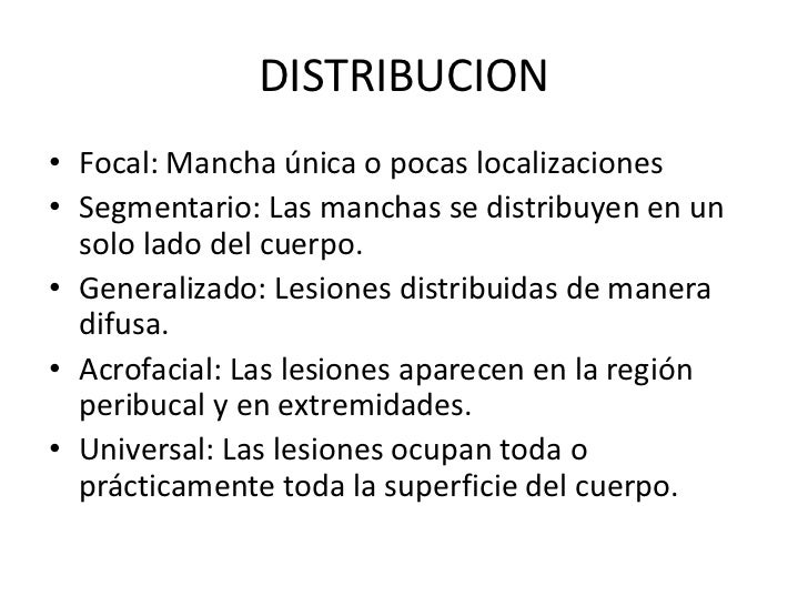11. 11. DISTRIBUCION• Focal: Mancha única o pocas localizaciones• Segmentario: Las manchas se distribuyen en un solo lado del cuerpo.• Generalizado: Lesiones distribuidas de manera difusa.• Acrofacial: Las lesiones aparecen en la región peribucal y en extremidades.• Universal: Las lesiones ocupan toda o prácticamente toda la superficie del cuerpo.
