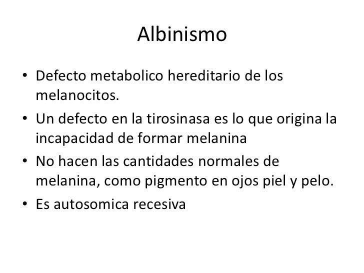 3. 3. • Dos genes albinos• No se manifiesta en personas a menos que ambos padres contengan el gen para el albinismo