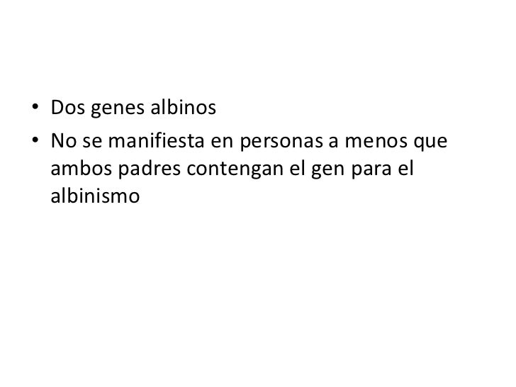 • Dos genes albinos• No se manifiesta en personas a menos que  ambos padres contengan el gen para el  albinismo