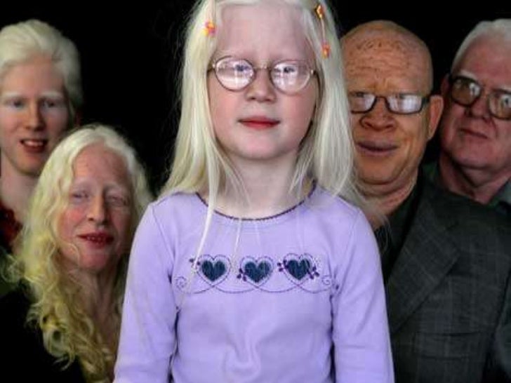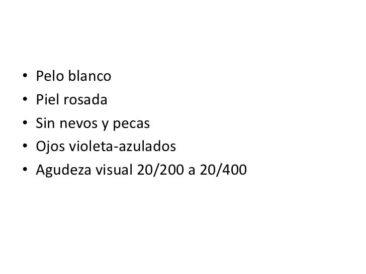 4. 4. • Pelo blanco• Piel rosada• Sin nevos y pecas• Ojos violeta-azulados• Agudeza visual 20/200 a 20/400