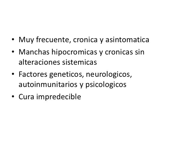 • Muy frecuente, cronica y asintomatica• Manchas hipocromicas y cronicas sin  alteraciones sistemicas• Factores geneticos,...