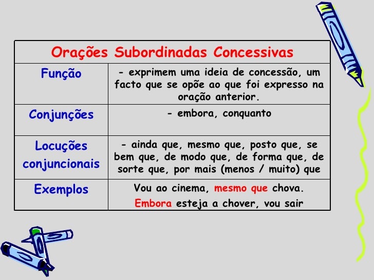 11. 11. Orações Subordinadas Concessivas Função - exprimem uma ideia de concessão, um facto que se opõe ao que foi expresso na oração anterior. Conjunções - embora, conquanto Locuções conjuncionais - ainda que, mesmo que, posto que, se bem que, de modo que, de forma que, de sorte que, por mais (menos / muito) que Exemplos Vou ao cinema, mesmo que chova. Embora esteja a chover, vou sair