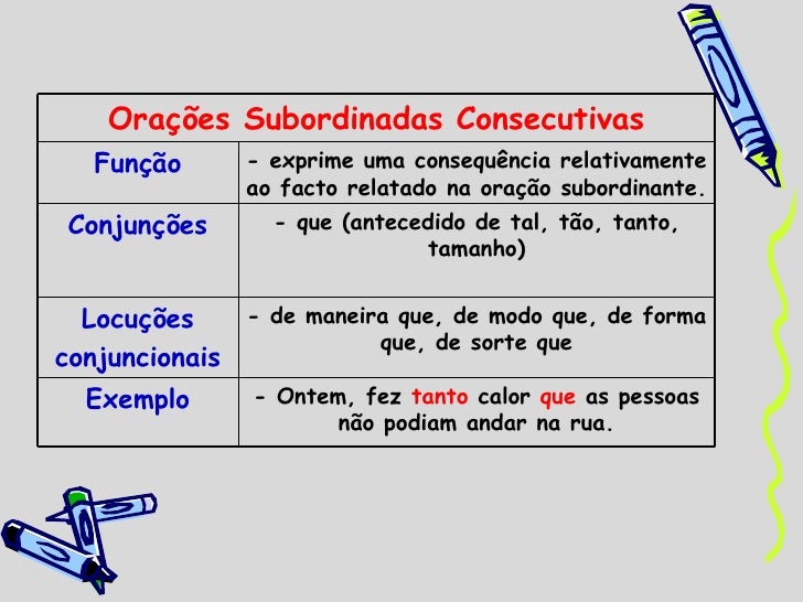 12. 12. Orações Subordinadas Consecutivas Função - exprime uma consequência relativamente ao facto relatado na oração subordinante. Conjunções - que (antecedido de tal, tão, tanto, tamanho) Locuções conjuncionais - de maneira que, de modo que, de forma que, de sorte que Exemplo - Ontem, fez tanto calor que as pessoas não podiam andar na rua.