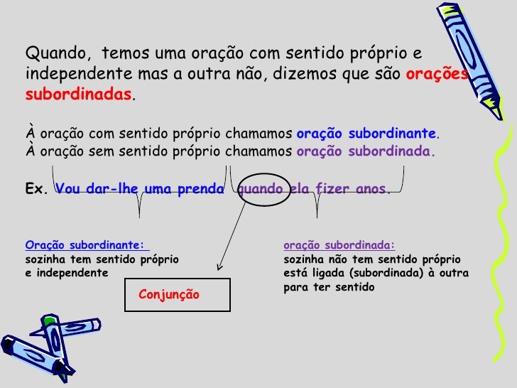2. 2. Quando, temos uma oração com sentido próprio e independente mas a outra não, dizemos que são orações subordinadas . À oração com sentido próprio chamamos oração subordinante . À oração sem sentido próprio chamamos oração subordinada. Ex. Vou dar-lhe uma prenda quando ela fizer anos. Oração subordinante: oração subordinada: sozinha tem sentido próprio sozinha não tem sentido próprio e independente está ligada (subordinada) à outra para ter sentido Conjunção