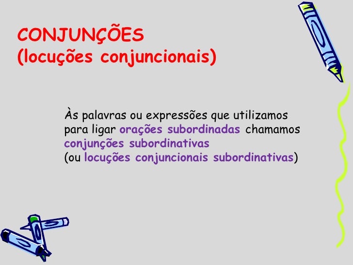 3. 3. CONJUNÇÕES (locuções conjuncionais) Às palavras ou expressões que utilizamos para ligar orações subordinadas chamamos conjunções subordinativas (ou locuções conjuncionais subordinativas )