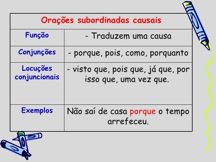 5. 5. Orações subordinadas causais Função - Traduzem uma causa Conjunções - porque, pois, como, porquanto Locuções conjuncionais - visto que, pois que, já que, por isso que, uma vez que. Exemplos Não saí de casa porque o tempo arrefeceu.