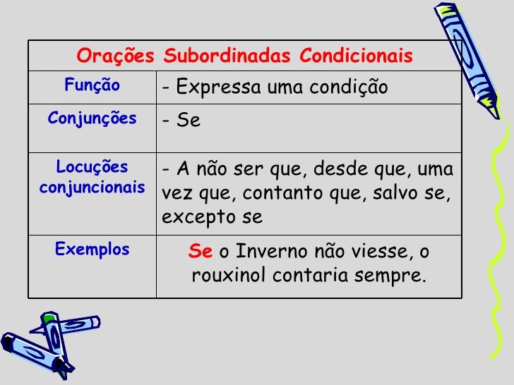 6. 6. Orações Subordinadas Condicionais Função - Expressa uma condição Conjunções <ul><li>Se </li></ul>Locuções conjuncionais - A não ser que, desde que, uma vez que, contanto que, salvo se, excepto se Exemplos Se o Inverno não viesse, o rouxinol contaria sempre.