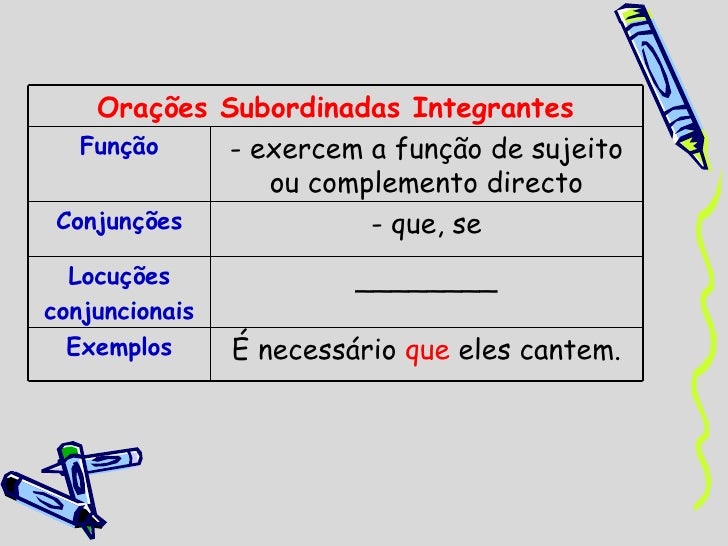 9. 9. Orações Subordinadas Integrantes Função - exercem a função de sujeito ou complemento directo Conjunções - que, se Locuções conjuncionais ________ Exemplos É necessário que eles cantem.