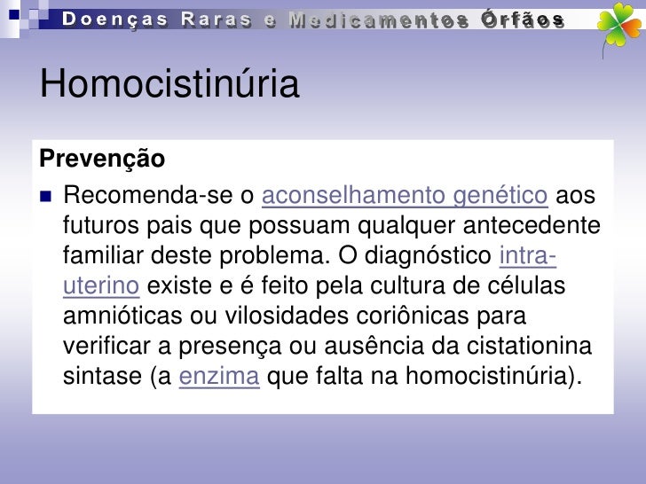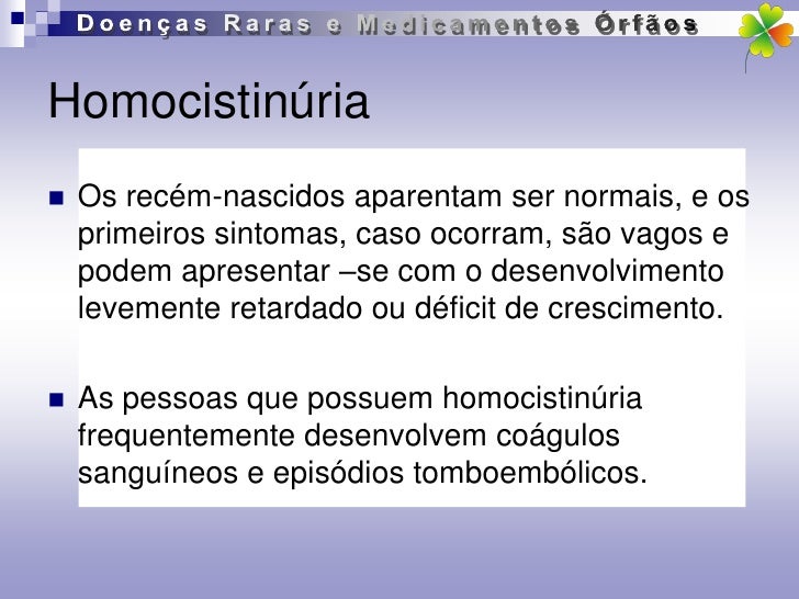 9. 9. Homocistinúria Prognóstico  Apesar de não haver uma cura específica para a homocistinúria, aproximadamente a metade das pessoas afetadas consegue se beneficiar das terapias atuais. Complicações:  As complicações mais sérias são decorrentes dos coágulos sangüíneos, e esses episódios podem ser mortais. Solicitação de assistência médica:  Solicite assistência médica se você ou algum familiar mostrar sinais e sintomas de homocistinúria.