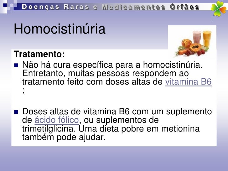 8. 8. Homocistinúria Tratamento:  Não há cura específica para a homocistinúria. Entretanto, muitas pessoas respondem ao tratamento feito com doses altas de vitamina B6 ;  Doses altas de vitamina B6 com um suplemento de ácido fólico, ou suplementos de trimetilglicina. Uma dieta pobre em metionina também pode ajudar.